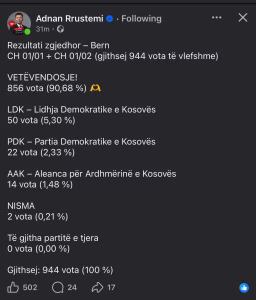 Sipas të dhënave të publikuara nga statusi në Facebook i Adnan Rrustemi, rezultati i votimit të diasporës shqiptare në Bern të Zvicrës tregon një mbështetje dërrmuese për VETËVENDOSJE!.
